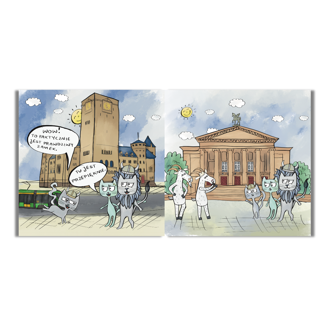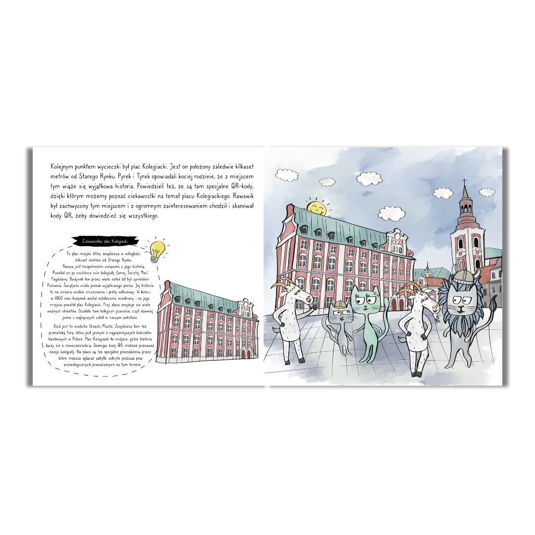 „Rawawik zwiedza Poznań” to opowieść o pełnej przygód wyprawie Rawawika i jego rodziców do stolicy Wielkopolski. Kociak spotyka tam koziołki, które mają równie dużo energii co mały wiking, więc od razu znajdują wspólny język. Nowo poznani znajomi oprowadzają kocią rodzinę po tym pięknym mieście. Lepszych przewodników niż poznańskie koziołki nie można sobie wymarzyć, prawda? Rogate stworzenia nie tylko pokazują swoim gościom miejsca, które warto odwiedzić, ale też zdradzają im ciekawostki na temat Poznania i jego historii.